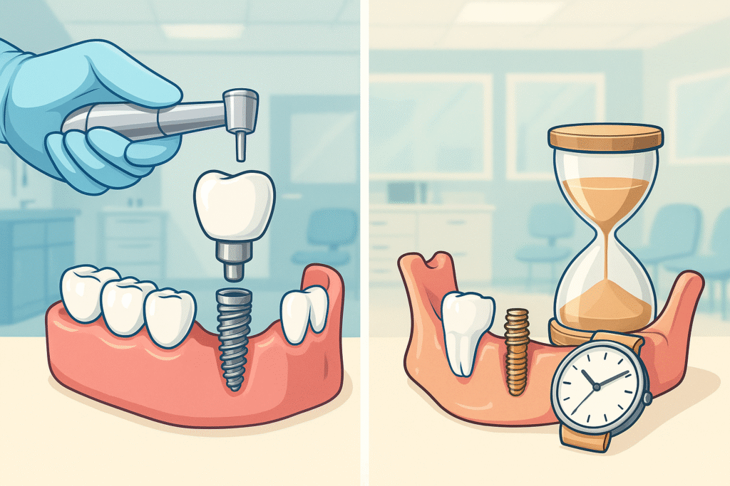 - الزرع المُرحّل: ننتظر التئام العظم أولًا لثبات أعلى عندما يكون العظم ضعيفًا أو هناك التهاب سابق.